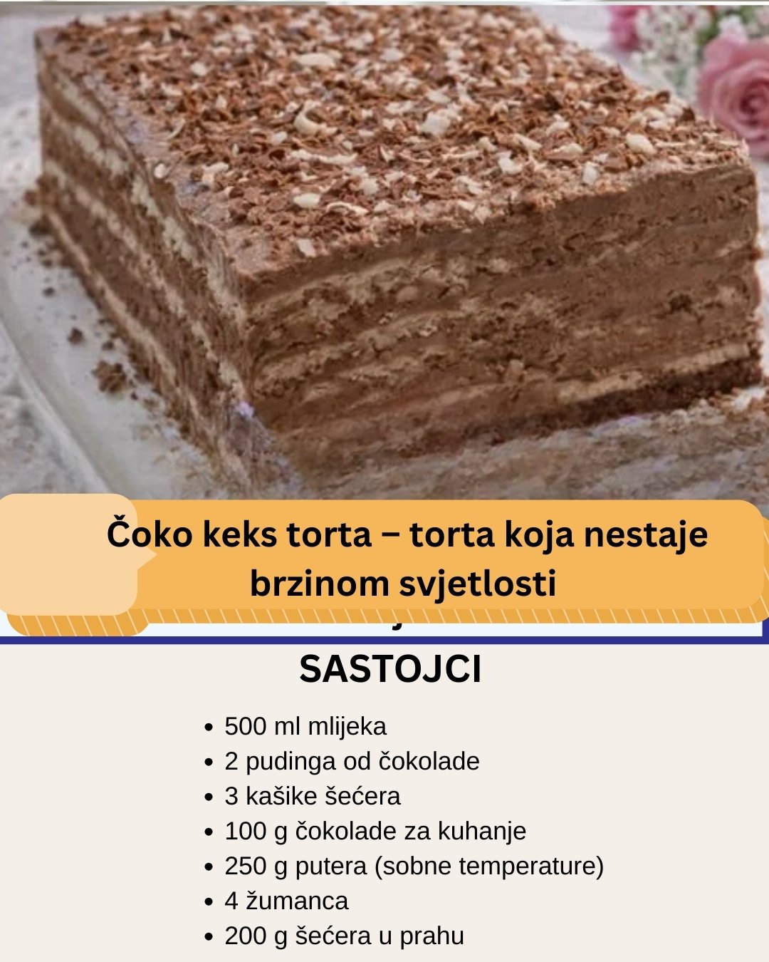 Čoko keks torta je jedna od najpopularnijih torti bez pečenja. Jednostavna je za pripremu, ne zahtijeva puno vremena, a okus joj je bogat, kremast i čokoladan. Savršena je za porodična okupljanja, rođendane ili kada želite brz i siguran desert koji svi vole.