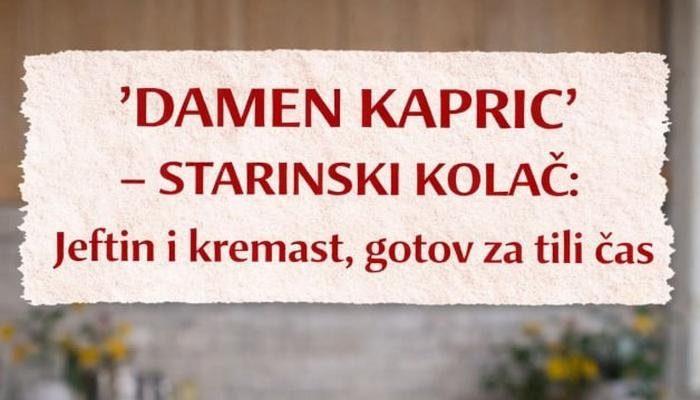š° āDAMEN KAPRICā ā STARINSKI KOLAÄ š§ Sastojci: Kora: 4 jaja 120 g Å”eÄera 1 vanilin Å”eÄer 120 ml ulja 120 ml mleka 200 g glatkog braÅ”na 1 praÅ”ak za pecivo Srednji sloj: 6ā8 kaÅ”ika gustog džema (kajsija ili Å”ipak ā kao na slici) Krem: 700 ml mleka 2 pudinga od vanile 4ā5 kaÅ”ika Å”eÄera … Read more
