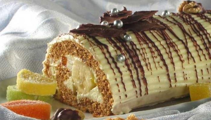 7. Cijele banane rasporedite uz rub biskvita s one strane s koje ćete početi savijati roladu. Savijenu roladu izvana premažite preostalom kremom.