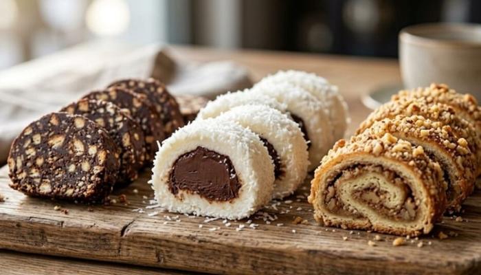 Kao što možete videti na fotografiji, pred vama su tri fantastična ukusa: tamna čokoladna salama sa komadićima keksa, snežno beli kokos rolat punjen čokoladnim kremom, i mekani svetli rolat sa bogatim punjenjem, spolja obložen keksom ili seckanim orašastim plodovima. Svi nastaju iz iste posude, što ovaj recept čini neverovatno praktičnim i ekonomičnim.