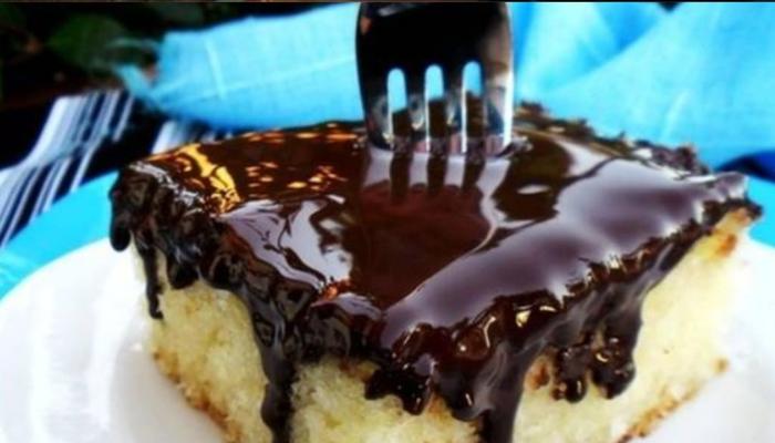 Vruć kolač u tepsiji iseći na kocke i preliti.