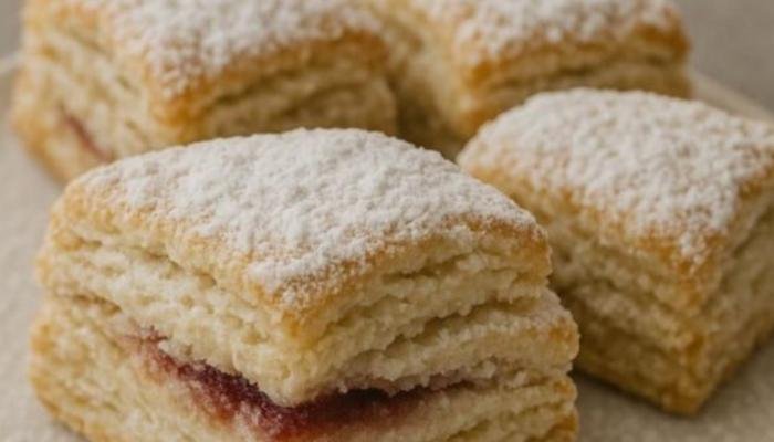 Postupak razvlačenja i preklapanja ponoviti još jednom. Nakon drugog odmaranja, testo razviti, seći na kvadrate, u sredinu stavljati kašičicu džema i pažljivo preklopiti u trouglove ili pravougaonike.