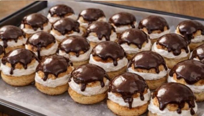 Slatko vrhnje čvrsto umutite sa malo šećera. Na tanjir složite neprelivene biskvite, premažite ih slatkim vrhnjem i poklopite glaziranim biskvitima.