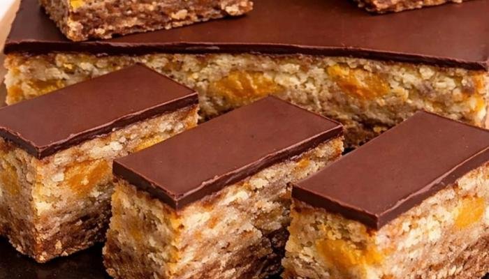 Za drugu koru: U šerpi otopite šećer, pa dodajte margarin. U blenderu usitnite pomorandžu, sa sve korom, i dodajte u vodu sa šećerom i margarinom. Zatim u posudu sipajte izlomljeni keks i dodajte orahe. Preko sipajte smesu sa šećerom i margarinom. Lepo sjedinite. Uzmite nekoliko kajsija iz kompota, iseckajte i dodajte u keks. Promešajte i dodajte preko prve kore i poravnajte.