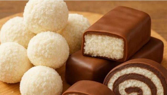 Od samo jedne osnovne kokosove smese dobijaju se čak tri potpuno različita kolača – mekane Rafaelo kuglice, čokoladne Bounty štanglice i dekorativan crno-beli kokos rolat.