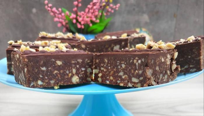 Izrucite smesu u obložen kalup i ravnomerno utapkajte te ostavite da se stegne u frižideru oko 2 sata. Smesu pažljivo izvadite iz celofana pa vratite u kalup i prelite sa čokoladnom glazurom koju ste otopili na pari sa uljem. Vratite bajaderu u frižider da se stegne i onda pažljivo oštrim nožem ili skalperom isecite jednake kocke, po želji pospite lešnicima. Prijatno, i u nastavku pogledajte i ostale slične recepte.