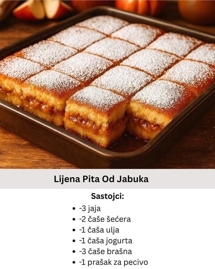 Lijena pita od jabuka je jedan od onih kolača koji osvajaju već na prvi zalogaj. Mekana, sočna i bogata punjenjem od jabuka, a pritom izuzetno jednostavna za pripremu. Idealna je kada želite domaći kolač bez razvlačenja kora i dugog stajanja u kuhinji. Savršena uz šolju kafe ili čaja, ova pita je pravi porodični favorit.