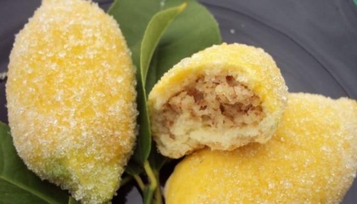 Tjesto ovako presavijte. Okrenite na drugu stranu i stisnite kao bonbončić. Poredajte na lim obložen pek papirom i pecite ih na 160 otp 20 minuta. Ohlađene limune namočite u mlijeko u koje ste dodali boju i maraskino, uvaljajte ih u šećer.