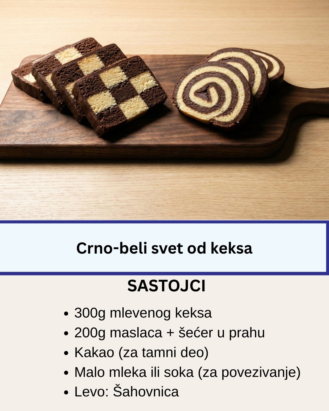 Crno-beli svet od keksa je jedan od onih brzih, starinskih kolača bez pečenja koji se pamte po jednostavnosti i efektnoj šari. Kombinacija svetlog i tamnog sloja u obliku šahovnice čini ga ne samo ukusnim već i vizuelno vrlo atraktivnim. Idealan je kada vam se jede nešto slatko, a nemate mnogo vremena. Ovaj kolač se pravi … Read more