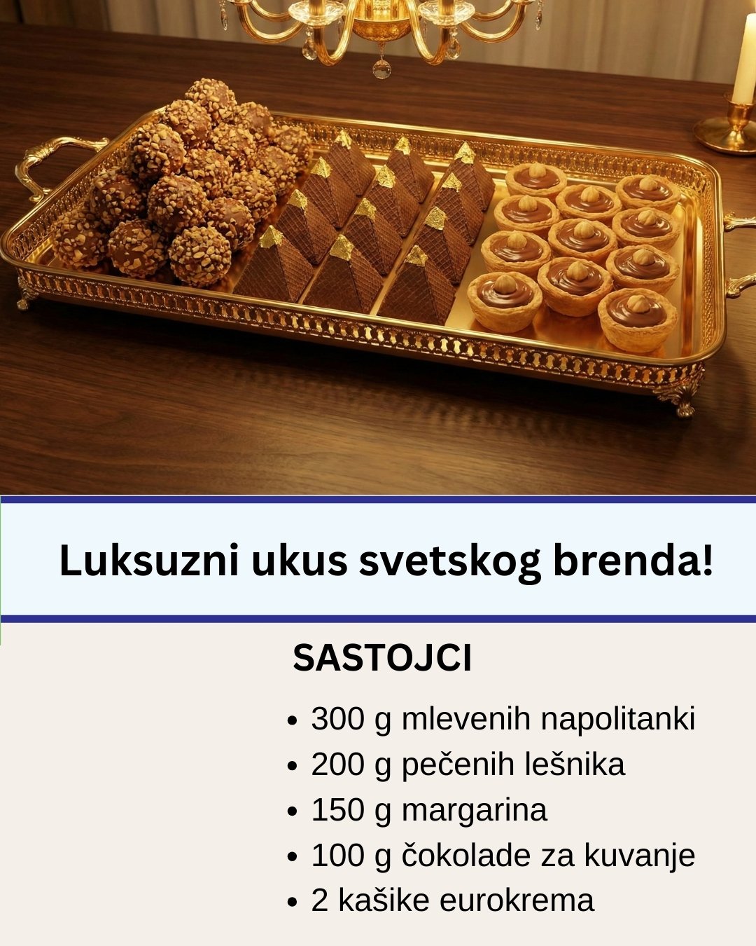 Ova raskošna poslastica donosi duh svetskih čokoladnih brendova pravo na vašu trpezu. Spoj mlevenih napolitanki, pečenih lešnika, čokolade i eurokrema daje bogat, pun i kremast ukus koji se topi u ustima. Od jedne smese mogu se pripremiti različiti elegantni oblici – kuglice, trouglovi ili mini korpice – savršeni za svečane prilike, praznike i posebna posluženja. … Read more