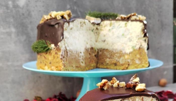 Za zavrsni deo izmiksajte šlag pa mu dodajte orahe i kandirano voce, te rasporedite po torti.