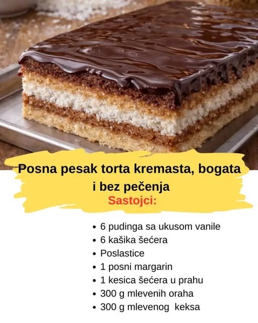Posna pesak torta je savršen izbor kada želite brz, jednostavan, a izuzetno ukusan desert. Ova torta se ne peče, kremasta je i bogatog ukusa, pa je idealna za post, slavske trpeze ili kada vam dolaze gosti, a nemate mnogo vremena. Slojevi mlevenog keksa, oraha i vanila krema u kombinaciji sa čokoladnim prelivom čine ovu tortu neodoljivom.