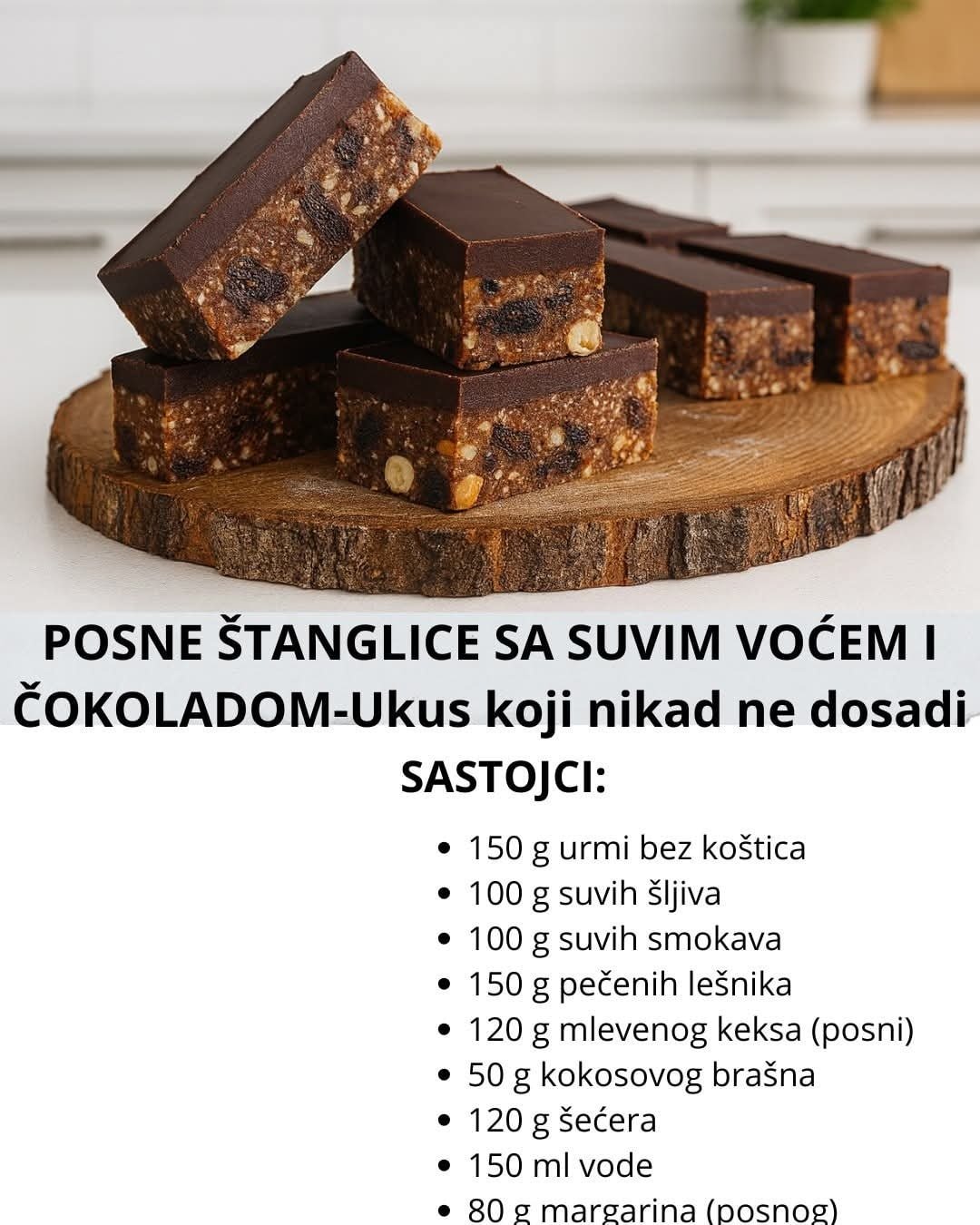 Posne štanglice sa suvim voćem i čokoladom su savršena kombinacija bogatog ukusa, prirodne slatkoće i čokoladne završnice. Bez pečenja, jednostavne za pripremu i izuzetno dekorativne, ove štanglice su idealne za posne dane, slave ili kao zdrava slatka užina uz kafu ili čaj.