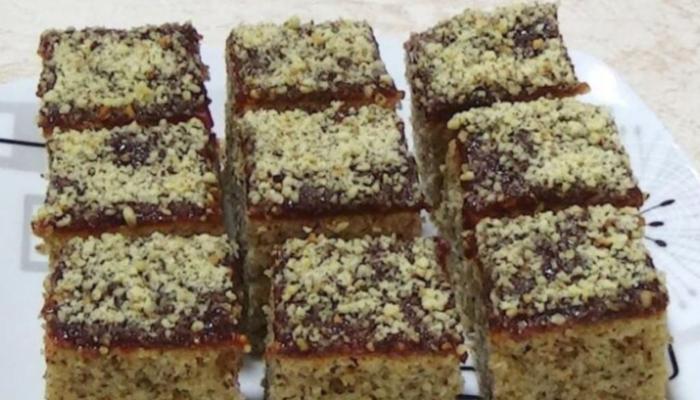 Pleh veličine 25×35 cm obložiti papirom za pečenje i izručiti smesu. Kolač peći na 200 stepeni oko 30 minuta. Kad se kolač ohladi, premazati ga džemom i posuti mlevenim orasima.