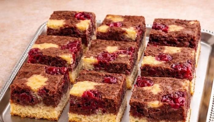 Ovaj jednostavan posni kolač iz rerne pravi se od dva testa – jednog svetlog i jednog sa kakaom i čokoladom. Kada se lagano pomešaju u plehu nastaje lep mramorni efekat, a višnje daju osvežavajuću voćnu notu.