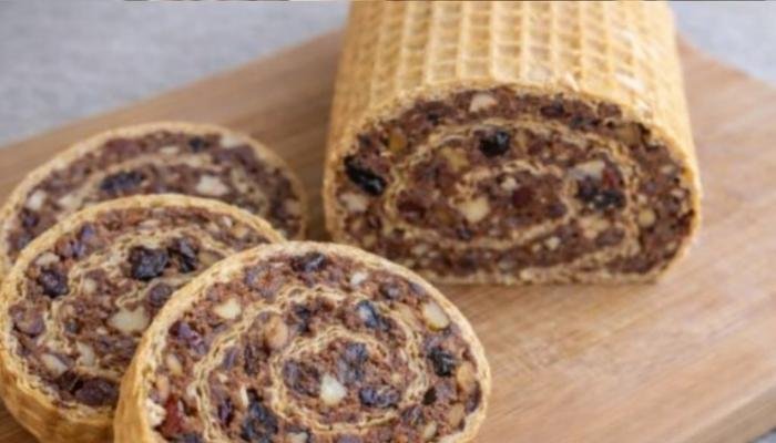 Na omekšanu oblatnu ravnomerno rasporedite fil od suvog voća, vodeći računa da ivice budu tanje kako se prilikom uvijanja ne bi raspadala. Pažljivo savijte u čvrst rolat i blago ga oblikujte valjanjem po radnoj površini.