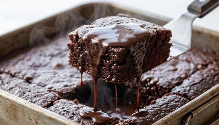Na slici vidimo taj savršeni, neodoljivi trenutak kada se metalnom špatulom pažljivo podiže jedan tek isečen, kvadratni komad pravo iz vruće metalne tepsije, otkrivajući nestvarno jasan i privlačan presek: izuzetno sočan i porozan tamni biskvit iz kog se još uvek vije topla para, dok se bogati preliv od topljene čokolade i mleka zavodljivo sliva preko mekih ivica, padajući nazad na dno posude.