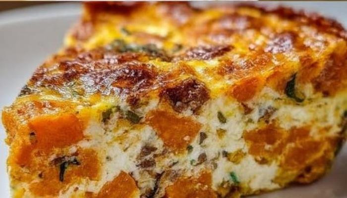 Počnite tako što ćete zagrijati rernu na 180°C. Slatki krompir oljuštite i isecite na kockice, a zatim ga skuvajte dok ne omekša. U velikoj posudi, umutite jaja sa mlijekom, dodajući so, biber, bijeli luk i luk u prahu. Dodajte rendani sir i pečenu kobasicu ili slaninu. Kada je krompir gotov, dodajte ga u smesu i sve dobro promešajte. Prebacite u podmazan pleh i pecite u rerni oko 30-35 minuta, ili dok gornji sloj ne postane zlatno smeđi. Ohladite pre serviranja.